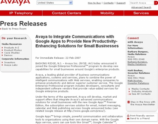 발표 내용은 어바이어 IP텔레포니 장비가 앞으로 '구글앱스' 지원한다는 내용입니다. '구글앱스'는 구글이 중소기업 시장 공략을 위해 내놓은 웹기반 소프트웨어 서비스 스위트로 웹오피스, 인스턴트 메신저, e메일, 캘린더 기능 등을 아우르고 있습니다. 최근에는 유료 모델 '구글앱스 프리미어 에디션'까지내놔 MS와의 생산성 SW전쟁에 관심이 모아지고 있죠.