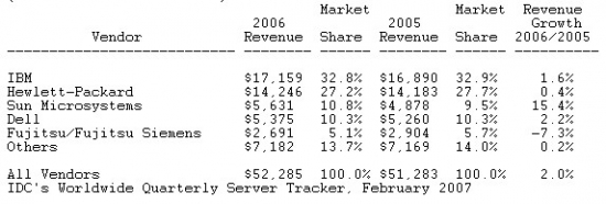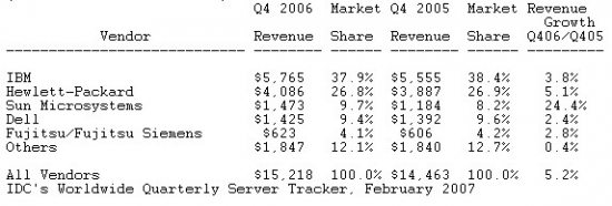 시장 조사 기관 IDC에서 2006년 4분기 세계 서버 시장 자료를 발표했다. Worldwide Server Market Gains Momentum in Fourth Quarter as Market Revenues Exceed $52 Billion in 2006, According to IDC