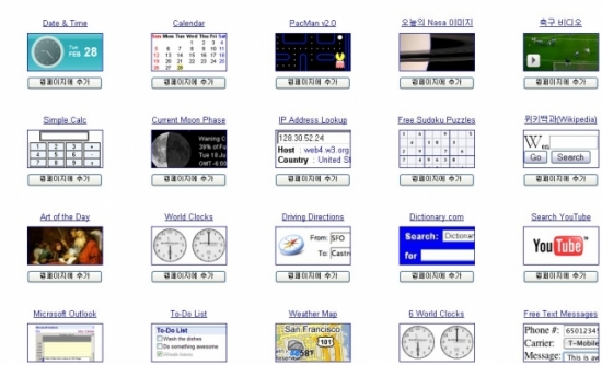 위의 사진은 개인화 홈페이지를 꾸미는데 필요한 구글가젯 목록이다. 아직까지는 일반 개인 사용자들이 많이 쓰고 있다.