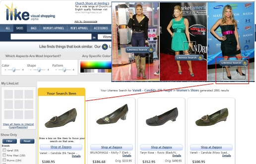 또한, riya(http://www.riya.com)는 얼굴 자동 인식 기능을 이용해 자동 태깅을 지원하는 서비스를 제공합니다. 이 솔루션을 응용하면 특정 사진과 유사한 사진을 자동으로 검색하는 엔진으로도 활용 가능하겠죠. 실제 이를 이용한 쇼핑 사이트인 like(http://www.like.com)은 색상과 형태가 유사한 상품을 검색해줍니다. 즉, 특정한 연예인이 신은 신발을 검색하고 싶을 때에 자동 사진 인식 기술을 이용하면 쉽게 특정 상품 검색이 가능하겠죠.