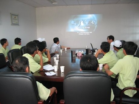 참관단은 홍보관을 나와 위층으로 올라가서 영상을 곁들인 레노보 현황 소개를 들었다. 이 곳에서도 방진화를 신고서 컴퓨터 조립생산라인으로 들어갔다.