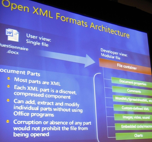 MS는 초기 오피스 2000에서 XML로 정의된 속성을 갖는 HTML 문서를 소개했고 뒤를 이어 Office XP에서는 SpreadsheetML이라는 첫번째 XML 참조 모델을 제공했다. 그리고 Office 2003에서는 WordprcessingML과 한층 강화된 SpreadsheetML 참조 모델을 통해 문서에 데이타를 저장하고 추출하는 방법을 제공했다. 가장 최근에 출시된 Office 2007은 DOC, XLS, PPT 파일의 기본 포맷을 XML 기반으로 하는 데 이 포맷이 바로 Open XML이다.