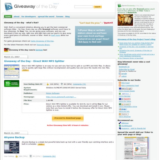 Giveaway라는 말이 견본이란 뜻이라는 것을 감안해 보면, 유저들이 일단 정품 소프트웨어를 무료로 다운받고 나면, 제작사들은 인지도를 올릴 수 있고, 그로 인해서 다음 개발 버전을 지속적으로 다운받을 수 있도록 하기 위해 만든 사이트라고 생각합니다. 고정수익을 올릴 수 있는 유저를 확보하기 위해 약간의 출혈은 감내하겠다는 의도겠지요.