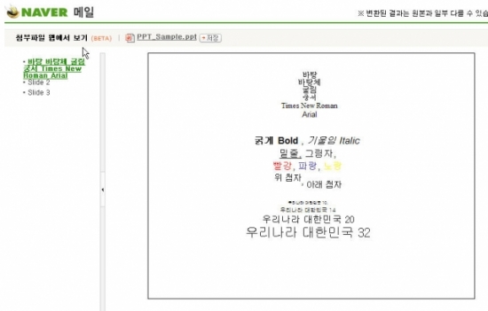 먼저, 네이버로 로그인 후 메일에 접속해 보십시요. 그리고 오피스 문서나 HWP문서가 첨부된 메일을 열어 보십시요. 해당 메일의 첨부 문서에 "웹으로 보기(BETA)"라는 기능이 추가되어 있을 것 입니다.