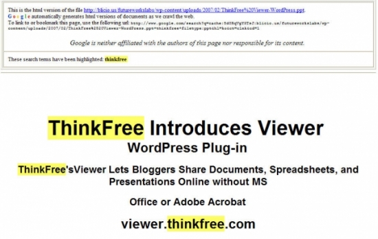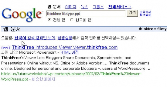 다른 서비스와 비교하기 위해 구글에 접속한 후 "thinkfree filetype:ppt"란 명령어로 파일을 검색해 보십시요.