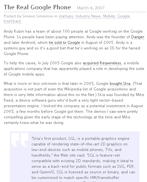 예상하시겠지만 구글은 구글폰을 둘러싼 루머에 대해 함구하고 있습니다. 그런데도 루머는 계속 확대재생산되는 모양새를 띄고 있습니다. 애플 아이폰이 세상에 나오기전 걸었던 길과 비슷한 점이 있지요.