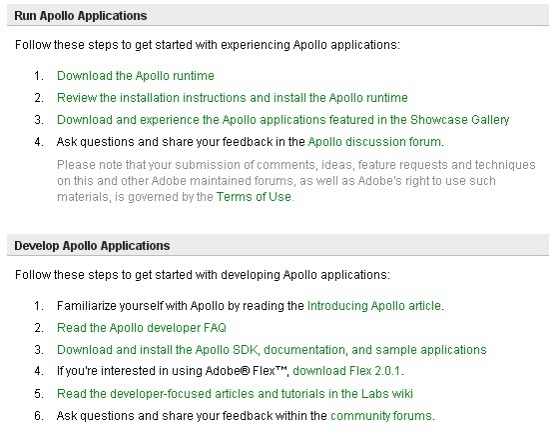 아폴로는 웹과 데스크톱의 결합을 표방하는 RIA 플랫폼이다. 개발자들은 아폴로를 활용해 플래시 뿐만 아니라 HTML, 아작스 등 다양한 웹개발 언어로 애플리케이션을 만들 수 있다. 이렇게 해서 개발된 애플리케이션은 웹과 데스크톱에서 모두 쓸 수 있다. 이렇게 되면 브라우저를 거치지 않고 PC에서 직접 인터넷을 쓸 수 있는 환경이 만들어진다. 어도비는 아폴로를 앞세워 웹애플리케이션에 대한 정의를 새로 쓰겠다는 청사진을 갖고 있다.