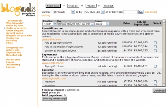 위에는 Blogads의 실제 가입해서 들어가면살수 있는 블로그 광고 입니다. 자 보다시피 PerezHilton.com 이란 블로그는약 한달에 3만불 (3천만원) 정도 하죠?