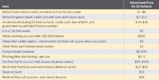위에 표는 지하경제서버에서 판매되는 각종 정보의 가격이다. e메일 리스트 2만9천개 가격이 5달러인데 반해 스카이프 계정은 12달러에 거래되는게 흥미롭다. 온라인 결제 서비스 페이팔 계정은 최고 500달러에까지 판매되고 있다.