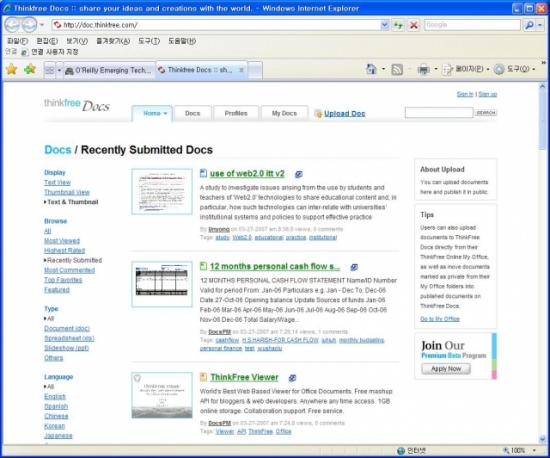 ThinkFree Docs는 말그대로 이미지 파일들을 업로드하고 이들을 공유하는 UCC 서비스입니다. 사용자는 자신이 작성한 오피스 파일을 업로드하고 이에 대한 태킹을 하며 다른 사람과 공유할 수 있습니다. 또한 어디서나 오피스 문서를 조회할 수도 있습니다. 아주 단순하면서도 직관적인 서비스입니다. 서비스의 모토는 "share your idea and creations with the world"입니다.