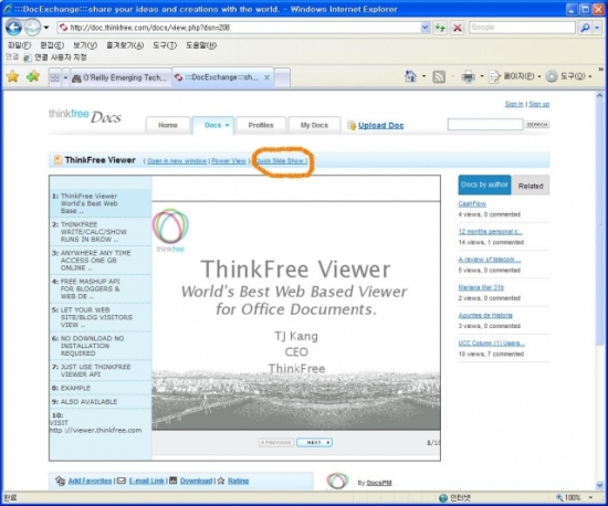 그리고 씽크프리는 이번에 'Flickr for Office Docs - Content Syndication through ThinkFree Doc Exchange'라는 제목으로 CEO인 강태진 대표이사가 씽크프리의 본격적인 오피스 문서 UCC 포털 서비스인 '씽크프리 닥스(ThinkFree Docs)'를 발표합니다.