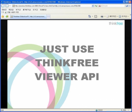 문서 조회를 해 볼까요? 원하는 문서를 클릭하면 아래와 같이 실시간에 HTML로 변환된 오피스 문서를 볼 수 있습니다. 아래 화면은 thinkfreeviewer.PPT 문서를 조회한 화면입니다.