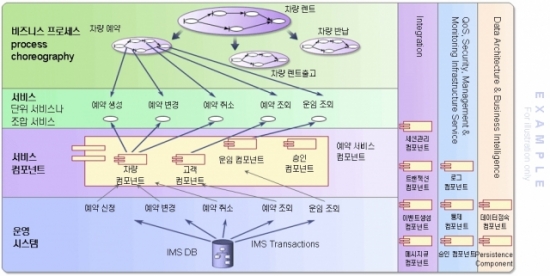 그림에서 보면 차량 컴포넌트의 경우 예약 생성 및 예약 변경 서비스에 영향을 주게 됩니다. 그리고 예약 생성, 예약 변경, 예약 취소 예약 조회, 운임 조회 등의 서비스가 조립되어 차량 예약 프로세스를 만들어 냅니다. 서비스는 각각 업무 시스템이 특정 시스템을 통해 구현된 것을 의미할 수도 있고 신규로 만들어진 서비스를 의미할 수도 있지만 이 모든 것은 재활용 및 재성성 가능한 아키텍처를 기반으로 삼고 있다는 것을 확인할 수 있습니다. 즉 서비스나 프로세스의 부분적인 변화가 나타나더라도 유연한 대처를 가능하게 할 수 있는 시스템 아키텍처가 구성되어 있다는 것을 뜻합니다.