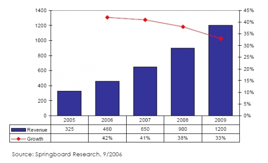 2006년 9월 Springboard Research에서 조사한 아시아 태평양 지역의 SOA 시장 규모 분석 자료는 아래와 같습니다. 자료에 의하면 Revenue 크기는 4배 가까이 성장할 것으로 예상되며 해마다 30% 이상의 시장 성장을 예측하고 있습니다.