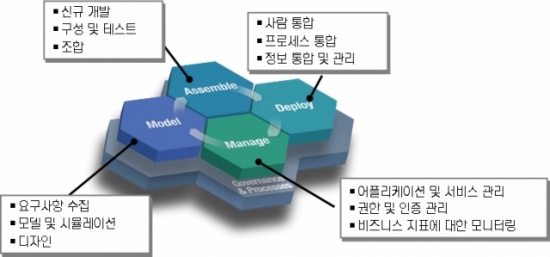 어느 벤더의 어느 솔루션을 선택하든지 서비스 지향 아키텍처(SOA) 구현은 아래와 유사라이프 사이클을 가집니다. SOA 라이프 사이클은 모델(Model) -> 조립(Assemble) -> 전개(Deploy) -> 관리(Manage)의 절차를 거치게 되며, 이 모든 단계는 SOA 거버넌스를 통해 관리되고 통제됩니다.