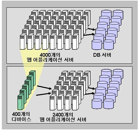 그림의 경우 실제로 인터넷 경매로 유명한 e-Bay에서 구축한 사례입니다. e-Bay의 경우 대부분의 데이터 처리가 XML 기반의 웹서비스로 구축되어 있었으며 XML 사이의 데이터 변환 요건이 실제 업무에서 차지하는 비중은 40% 이상이었습니다. 따라서 이 부분의 처리를 위해 4000개 이상의 웹 어플리케이션을 사용하고 있었습니다. 성능의 향상과 비용의 감소를 위해 e-Bay의 경우 어플리케이션에서 부하가 많이 걸리는 부분을 디바이스를 도입하여 해결하였는데, XML 변환 로직을 디바이스로 내렸기 때문에 성능 향상이 보장되었으며, 이를 통해 전체 웹 어플리케이션 서버의 40%를 감소시킬 수 있었습니다. 실제로 추가적으로 도입해야 할 하드웨어 및 소프트웨어의 가격과 디바이스의 도입에 따른 비용 비교를 해보면 그 차이는 자명합니다. 물리적으로 그 수가 줄어들 뿐만 아니라 네트워크 유선 속도에 준하는 성능 향상이 보장되기 때문에 해당하는 자원의 물리적인 감소를 가능하게 합니다.