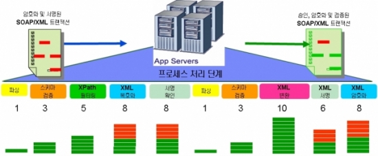 위의 그림의 경우 일반적인 XML 처리 시에 부하가 걸리는 단계에 대해 표현한 것입니다. XML의 변환 및 암복호와에 대부분의 시간이 소요되는 것을 확인할 수 있습니다. 웹서비스 및 SOA 보급이 보편화될수록 성능 향상을 위해 위의 사항이 어떻게 지원되느냐가 벤더의 차별성으로 자리매김될 수 있습니다. 현재 일부 벤더에서 디바이스를 통한 SOA 구현이 실제화되고 있으며, 어플리케이션마다 차이가 있겠지만 일부 고객 파일럿 사례의 경우 30배가 넘는 성능 향상이 이루어졌습니다.