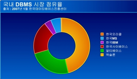 국내 DBMS 시장은 오라클이 46.2%를 차지해 한국마이크로소프트 24.2%와 한국IBM 19.2%를 멀치감치 따돌리고 승승장구 하고 있습니다. 고객들은 한국오라클의 8점대 버전을 주로 사용해 오다가 최근엔 10g 제품으로 많이들 업그레이드 하고 있습니다. 10g를 사용하는 전세계 고객사들이 늘고 있고, 제품이 출시되고 시간도 흘렀기에 기업들이 도입해 사용하는데도 아무런 문제가 없습니다.