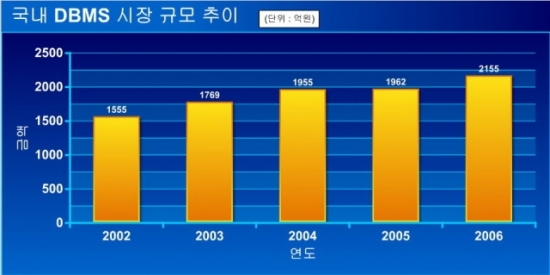 국내 DBMS 시장 규모는 지난해 2천 155억원 규모를 기록한 것으로 나타났습니다. 아래 도표를 보시면 아시겠지만 2004년과 2005년은 각각 1천 955억원과 1천 962억원으로 시장 자체가 정체돼 있었습니다. 기업들이 새로운 투자를 꺼렸다는 것을 한눈에 확인할 수 있습니다.