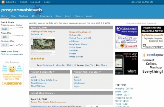 프로그래머블 웹에는 인기 매시업 리스트도 보여준다. 전체 매시업 리스트도 이름과 날짜별로 볼 수 있다. 4월 18일 현재 프로그래머블웹에 올라온 전체 매시업 리스트수는 1천802개, API는 415개에 달하고 있다. 블로그에는 매시업과 관련된 최신 소식들도 많이 올라와 있다.