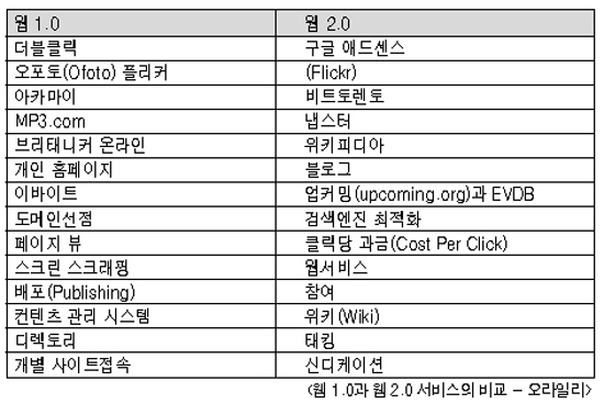 웹1.0 서비스와 웹2.0 서비스의 예를 비교해 표로 만들어 놓은 것이다. 위 표는 오라일리가 비슷한 성격의 사이트나 서비스를 웹2.0이라는 새로운 변화를 기준으로 비교해 놓은 것이다. 위 표를 요약해보면 다시 '개방, 공유, 참여'라는 세가지 화두로 정리할 수 있다.