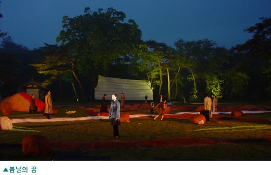 본행사가 시작되는가 싶더니 이내 주위가 깜깜해졌다. 준비해둔 조명이 켜지고 왕릉 앞 드넓은 잔디밭이 배우들의 읊조림과 몸동작으로 하나둘 채워진다. '봄날의 꿈'은 꽤나 색다른 예술공연이다. 다양한 예술가들이 26편의 국내 대표시들을 소리와 몸짓으로 이어 부르며 한편의 동화같고 환상적인 얘기를 완성하는 복합장르 음악극이다. 극중에선 삶의 주체할 수 없는 기쁨이 분출되는가 하면 격랑의 세월에 휘둘리는 고단한 인생이 비쳐지기도 한다. 삶의 희로애락이 봄여름가을겨울 사계절에 빗대 시와 노래로 펼쳐졌다. 16명의 배우가 26편의 시를 춤과 노래로 잇달아 낭송하고, 임동창의 피아노 선율이 대열을 이끌었다. 한글로 만든 가장 아름다운 운율인 시를 사람들이 노래하는 장면이었다.