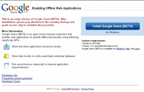 구글기어 베타판은 우선 자바 스크립트 개발자들에게 초점이 맞춰져 있다. 그러나 몇개월안에 일반 사용자들이 이용할 수 있는 제품도 선보일 예정이다. 용량은 1MB 정도.