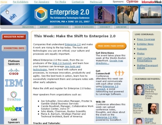 미국 보스턴에서 열리고 있는 엔터프라이즈2.0 컨퍼런스에서 엔터프라이즈2.0 시대를 주도해 나가겠다는 '빅블루' IBM과 'SW제국' 마이크로소프트(MS)의 함성이 울려퍼지고 있다. IBM, Microsoft Show Web 2.0 Wares(e위크 인터넷판)