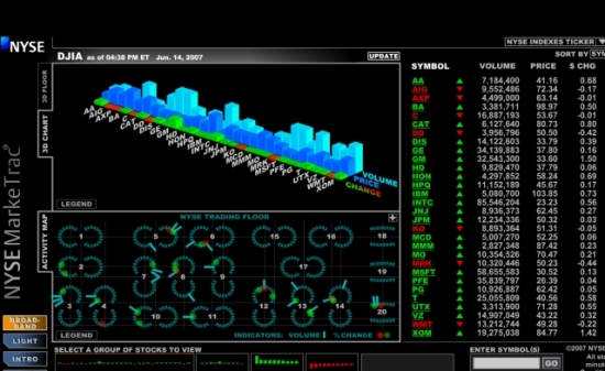 특징: 뉴욕 증시 상황을 마치 객장에 직접 나온 것처럼 한눈에 볼 수 있도록 Flex Chart 기능을 고도화했다. 3D Chart, 3D Floor, Activity Map 형태로 정보를 볼 수 있으며, 데이터가 서로 연동되어 있다.