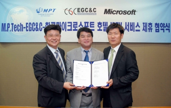 (사진설명; (좌측부터) 김용화사장(EGC&C), 요시모토 회장(M.P.TECH), 유재성 사장(한국마이크로소프트)이 협약 체결 후 기념촬영을 하고 있다)