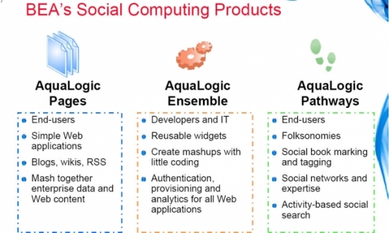 BEA는 최근 엔터프라이즈2.0 관련 솔루션 3종 을 공개한 바 있다. BEA가 선보인 솔루션은 '아쿠아로직 앙상블', '아쿠아로직 페이지', '아쿠아로직 패스웨이'. 소셜 네트워킹, 매시업 등 개인용 인터넷 서비스 분야를 뒤흔들고 있는 기술들을 대거 채용한게 특징이다.