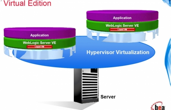 BEA가 선보인 가상화 솔루션은 웹로직 버추얼 에디션이다. 웹애플리케이션서버(WAS) 웹로직에 리퀴드 버추얼 머신(LVM)이 통합된 제품으로 컴퓨팅 자원을 보다 효율적으로 쓸 수 있도록 한다는 것을 골자로 하고 있다. 오는 7월 가격과 라이선스 정책이 발표될 예정이다.