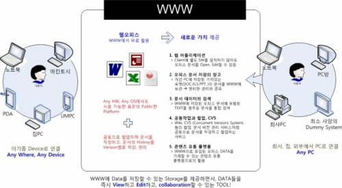예를 들어본다. 최근 NHN은 한컴 씽크프리와 웹 오피스 서비스의 제휴를 위한 MOU를 맺었다. 이것이 시사하는 바가 무엇일까? 이미 구글은 3월에 라이틀리(Writely)라는 웹 워드프로세서 업체를 인수한 적이 있다. 구글이 4명의 직원에 매출도 없던 Upstartle(Writely.com 개발업체)를 인수한 것은 무엇때문일까? MS가 '오피스 라이브'를 통해서 중소기업 대상의 이메일 계정 서비스와 협업툴을 제공하려는 것은 왜일까?