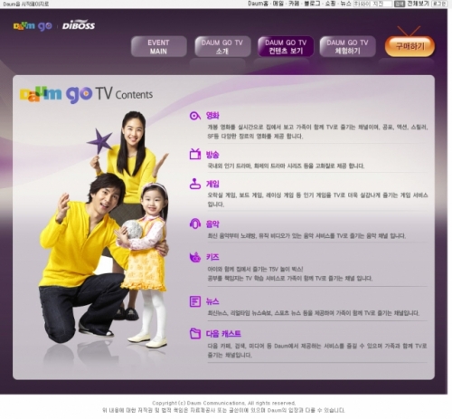 다음커뮤니케이션이 10월 17일 'GO TV'란 서비스를 선보였습니다. LCD 전문업체 디보스와 손잡고 내놓은 '일체형 TV포털' 서비스인데요. 여기서 '일체형'이란 셋톱박스와 TV를 하나로 묶었다는 얘기입니다.