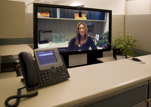 CEO나 임원용 사무실에 적합한 1인용 화상회의 솔루션인 텔레프레즌스 1000과 시스코의 IP폰. 65인치 대형 플라즈마 디스플레이를 통해 실제로 얼굴을 마주 한 것처럼 풀HD 화면으로 화상통화와 회의를 할 수 있다.(사진=시스코)