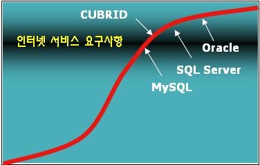 인터넷 서비스에서 필요로 하는 DBMS 요구사항은 기업 응용에 비하여 매우 선택적이고 집중적이다. 게임에서는 TPC 표준 벤치마크에서도 더 이상 관심이 없을 정도의 단순한 연산이지만 가공할 수준의 트랜잭션 성능을 요구한다. 게시판에서는 최적의 페이징 연산을 요구하고, 광고를 위해서는 임의추출(random sampling)이 가장 빈번한 연산이다. 블로그나 뉴스에서는 최근 자료의 접근빈도가 다른 자료에 비하여 월등하게 높다. 현재 출시된 어느 DBMS를 사용하여도 위의 연산들을 수행할 수는 있으나, 어느 제품도 이들 연산에 최적화되어 설계된 것은 아니다. 결국, 인터넷 서비스 DB 응용 개발에는 어느 제품이든 크게 다르지 않다는 뜻이다. 아래 그림은 각 DBMS의 기능 성숙도 대비 적용 응용을 나타낸 것이다. 항상 그렇듯이 노력 대비 성과는 ‘S’자 곡선을 갖는다. 기업응용 등 모든 측면에서의 기능 성숙도는 오라클이 가장 높으나, 인터넷 서비스 요구사항 측면에서는 네 가지 모두 만족스럽다고 할 수 있다.