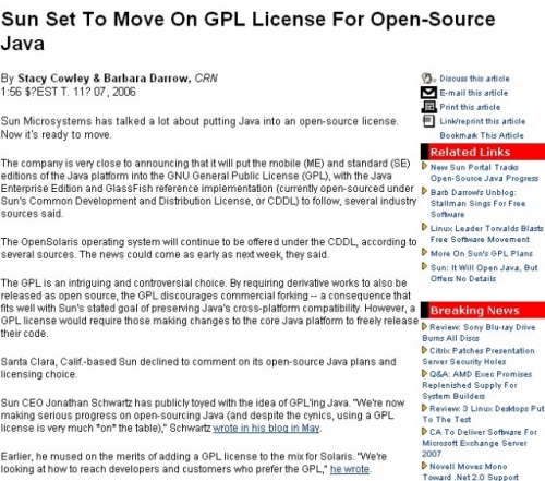 외신 보도를 보니 썬은 자바에 GPL((General Public License) v2를 적용하기로 했다. 13일 오전부터 PC매거진 과 CRN을 통해 이런 얘기들이 흘러나왔고, 월스트리트저널과 AP통신 등은 썬 관계자를 입을 빌어 자바에 GPL이 적용될 것이라고 보도했다.
