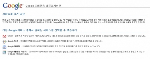 G메일', 인터넷전화 및 인스턴트메신저 '구글토크', 구글 캘린더, 웹페이지 디자인 툴 등 중소기업에 필요한 협업 기능을 제공하고 있다.