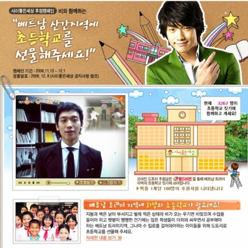 베트남 산간지역 '트라미'의 초등학생들을 위한 새 학교 건물 건립을 후원하는 이번 캠페인에는 전세계 지역을 대상으로 '희망의 학교짓기 캠페인'을 벌이고 있는 월드비전과 인기연예인 '비'가 동참한다.