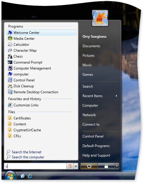 윈도비스타는 별도 프로그램을 내려받지 않고 OS에서 바로 데스크톱 검색 기능을 이용할 수 있게 해준다. 위의 사진을 보면 하단부에 검색창이 나오는데, 이게 바로 데스크톱 검색창이다. 검색어를 치면 왼쪽 공간에 검색 결과가 나타나며, 그 속도도 이전보다 빨라졌다는게 써본 사람들의 평가다.
