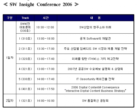 이외에도 'SW 인사이트 컨퍼런스 2006'은 SW산업의 화두로 떠오르고 있는 공개SW, 컨버전스 시대의 디지털콘텐츠 사업, SW수요예보 설명회 & 구매상담회와 SW기업의 수출 전략을 점검하는 IT Opportunity 2006, ‘품질혁신 공청회’ 등 7개 분야로 구성돼 있다.