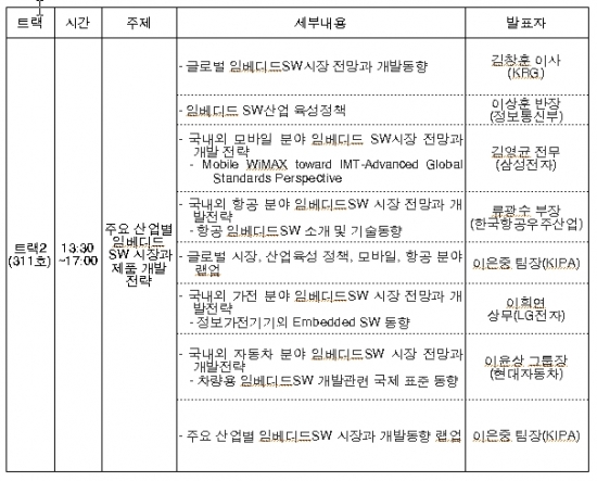 이 트랙에선 LG전자, 삼성전자, 현대자동차 임원과 한국항공우주산업 연구 책임자가 연사로 나서 모바일, 전자, 항공, 자동차 등 국내 주요 산업에 적용된 임베디드SW 제품 현황과 개발 전략, 해외 수출을 위해 필요한 요소들에 대해 발표를 할 예정이다. 정보통신부는 임베디드 소프트웨어 산업 육성 전략에 대해 브리핑하기로 했다.