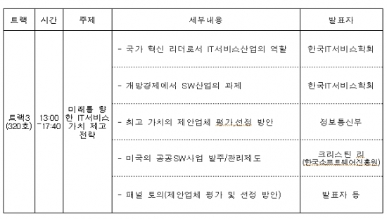 '미래를 향한 IT서비스 가치 제고전략' 은 SW산업에서 그 역할이 더욱 강조되고 있는 IT서비스 부문의 과제를 진단하기 위한 것이다. 국내 SW산업이 국내를 넘어 세계로 진출하기 위해선 IT서비스 기업과 SW기업이 동반상승하는 모델을 육성해야 한다는 의견이 많은 만큼 IT서비스 산업의 발전 방향에 대해 심도 있는 논의가 있을 것으로 예상된다.