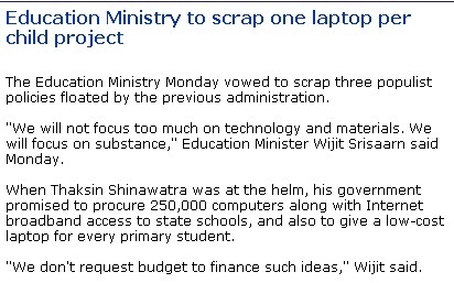 방콕포스트와 내이션멀티미디어닷컴에 따르면 Wijit Srisaarn 태국 교육부 장관은 100달러 노트북 구매 프로젝트는 물론 25만대의 PC조달, 각급 학교에 초고속 인터넷 보급 계획도 철회한다고 선언했습니다.