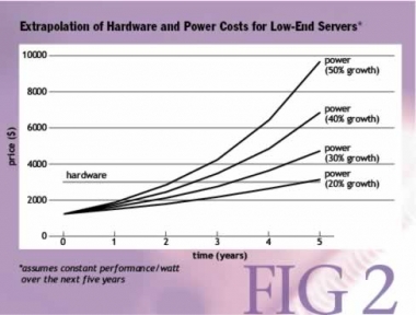 이러한 트렌드는 컴퓨팅 비용이 어떻게 구성되어 운영되는가를 고려할때 시사점이 매우 크다고 루이즈 안드레 바로소는 전한다. 간접적인 전력 비용을 배제하고 순수하게 에너지에만 중점을 두어 진행된 분석은 충격적이다. 일반적인 로우엔드 X86 기반 서버의 가격은 대략 3,000 달러 정도다. 이 제품은 피크타임에는 300와트 이상의 전력을 사용하지만 평균잡아 200 와트 정도의 전력을 소모한다.