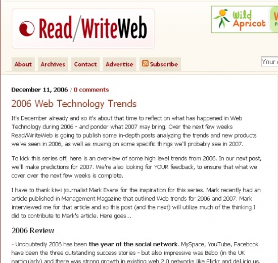이런 가운데 인터넷 분야 전문 블로그인 리드/라이트웹이 2006년을 뜨겁게 달군 인터넷 트렌드와 2007년을 조망하는 기획시리즈를 하겠다는 출사표를 던졌다.