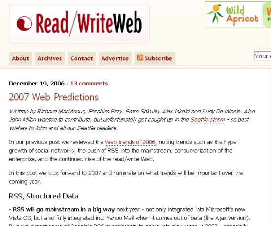 -2006년 뜨거운 관심을 모았던 RSS는 2007년 주류로 편입될 것이다. RSS는 마이크로소프트 신형 운영체제(OS) 윈도비스타에 들어가는 것외에 야후메일과도 통합된다. RSS와 관련한 구글의 실험도 2007년 보다 많아질 것으로 보인다. 특히 RSS 변종인 G데이터를 사용하는 구글베이스를 주목하길 바란다. 이외에도 새롭고 흥미로운 서비스들이 2007년 RSS위에 구현될 것으로 전망된다. Techmeme의 광고 전송 기술이 사례라고 할 수 있다.