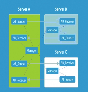 <그림 3>을 살펴보면, 3대의 서버(Server A, B, C)가 2개의 이중화 객체로 연결이 되어 있다. 각 서버 별로 이중화 매니저가 있어서 서버에 존재하는 이중화 담당 쓰레드(송신, 수신)를 관리한다. 이중화 송신 쓰레드는 트랜잭션 로그를 읽어서 연결된 이중화 객체를 통해 이중화 로그(Xlog)를 전달하는 역할을 하고 수신 쓰레드는 송신 쓰레드로부터 전달되어진 이중화 로그를 분석해 트랜잭션을 수행한다. B서버에서는 A서버와의 이중화(객체 REP_AB)를 위한 송, 수신 쓰레드가 모두 존재하므로 액티브-액티브(Active-Active) 상태로 운영중이고 C서버에서는 이중화 송신 쓰레드가 없고 수신 쓰레드만 있어 A서버가 액티브로 동작하고 C서버는 데이터를 받기만 하는 상태다. 이와 같이 알티베이스 이중화는 구성 방식에 따라서 다른 모델로 운영이 가능하며 확장성을 최대한 높일 수 있는 방식으로 구성함으로써 여러 노드를 활용해 성능을 향상시킬 수 있다.
