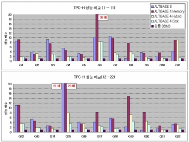 의사 결정 시스템과 같은 대용량 DBMS를 위한 평가도구로 활용되는 TPC-H(www.tpc.com) 테스트 결과, 알티베이스 4 기반에서 모든 테이블을 메모리로 설정한 경우와 테이블 규모나 액세스 빈도에 따라 메모리와 디스크로 테이블을 나눠 하이브리드 환경에서 운영한 경우의 성능이 높게 측정됐다.