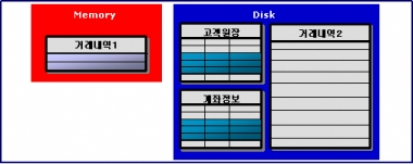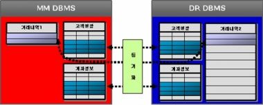 <그림 2>와 같이 트랜잭션 빈도수가 높은 거래내역1(최근 15일 거래내역)을 메모리 테이블로 생성하고 고객원장, 계좌정보, 15일 이전에 발생된 거래내역 등 나머지 정보를 담은 거래내역2 테이블은 트랜잭션 빈도수가 낮으므로 디스크 테이블로 구성할 수 있다. 이처럼 구성할 경우 별도의 DR DBMS가 필요 없을 뿐 아니라 SQL문을 통해 디스크, 메모리 테이블에 동시에 접근할 수 있어 메모리상에 별도의 계좌정보, 고객원장 테이블을 둘 필요가 없다.